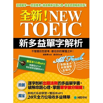 全新!NEW TOEIC新多益單字解析:這個單字,一定這樣考!徹底解析出題心理,黃金認證輕鬆到手! (附精讀.速讀雙版本MP3)購買網址:http://www.books.com.tw/exep/assp.php/87926/products/0010643359?utm_source=87926&utm_medium=ap-books&utm_content=recommend&utm_campaign=ap-201610
